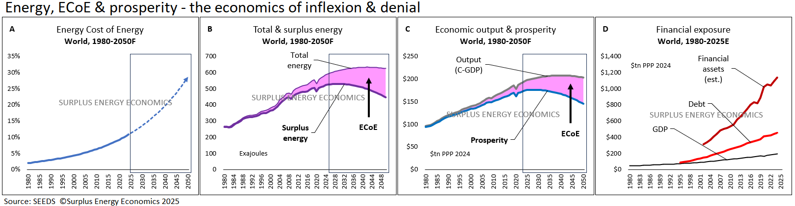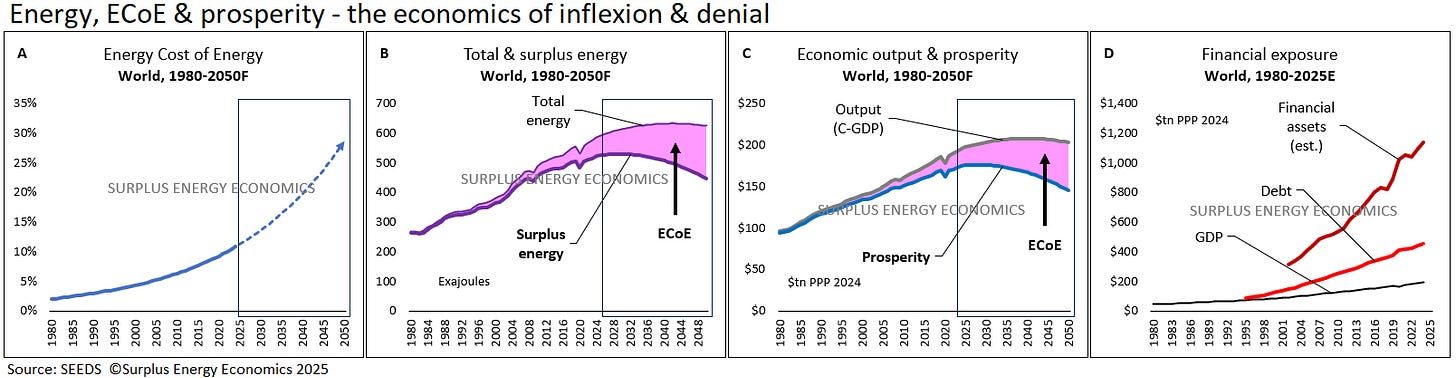 If it ever had to be admitted that economic growth had ended, you see, all existing social, political and commercial arrangements would be invalidated... (It) would put an end to the post-capitalist expediency (PCE) now prevalent in the West... ..The economy is not shaped by money. Within our two economies conception, we know that money has no intrinsic worth, but commands value only in terms of those material things for which it can be exchanged. This, in Surplus Energy Economics, is the principle of money as claim... Unlike money, energy and raw materials can’t be loaned into existence by the banking system, or conjured out of the ether by central banks... Money is a proxy for material economic prosperity, whilst the basis of this prosperity is the use of energy to convert natural resources into material products and infrastructures... ..Far from being limitless, the potential of technology is contained within an envelope of possibility whose boundaries are set by the laws of physics and the characteristics of materials... The claim that ‘exponential growth can go on forever in a finite world’ is made, if not exactly by ‘madmen and economists’, then on the basis of orthodox economics and cornucopian fantasy. Beyond its sheer size, what’s truly fascinating about the mania for all things AI-related is the way in which it fuses together the monetary and technological delusions that support the claim of never-ending economic growth.
