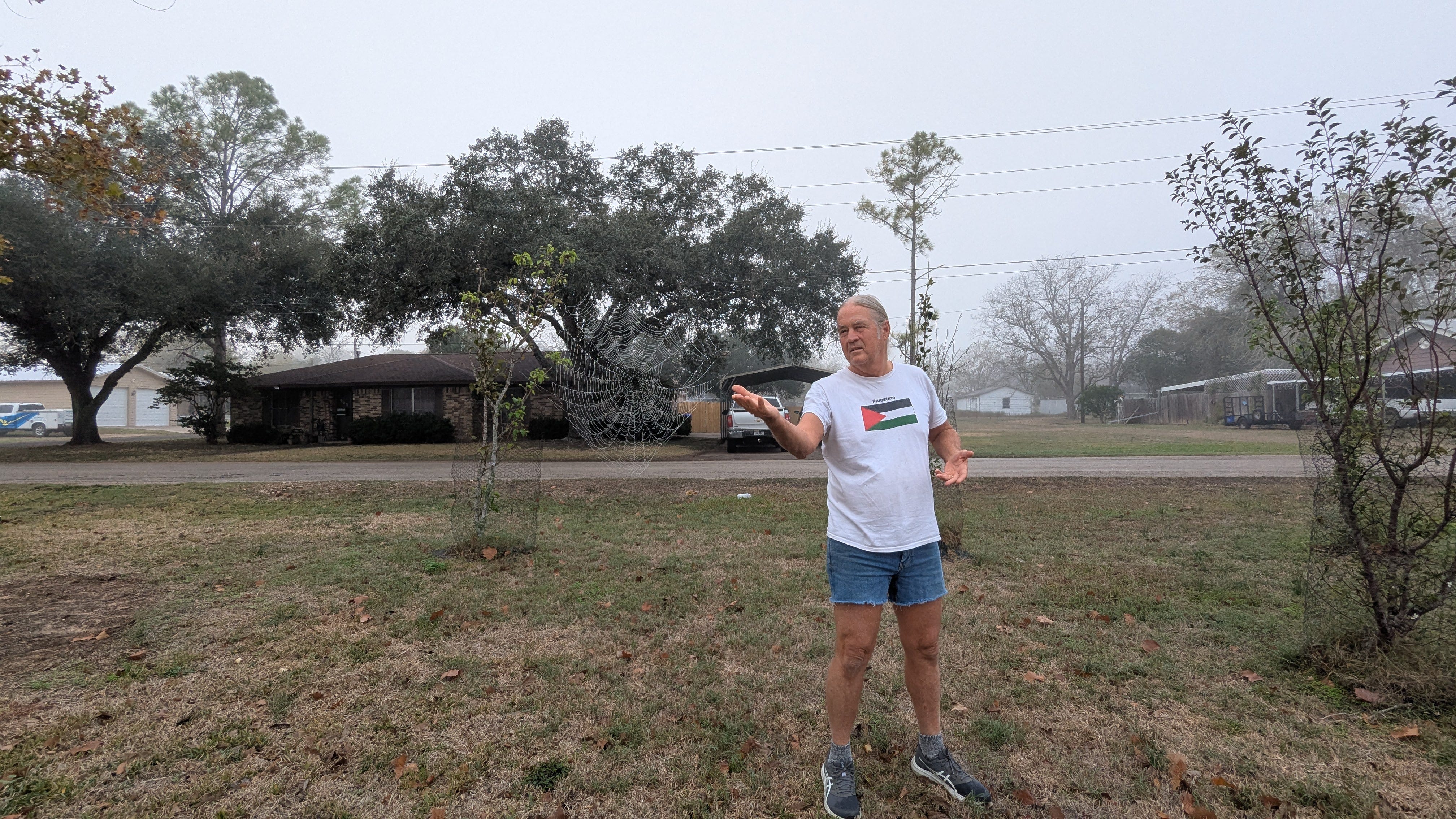 Natural Gardener (pictured with central part of 20 ft. wide spiderweb with dewdrops in morning mist)