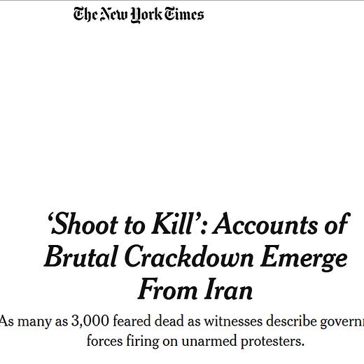 Mossad shooting Iranian protesters and police?:Maidan massacre in Ukraine déjà vu in NYT, Guardian & other reports from Iran with no evidence needed & no questions asked: “Witnesses spoke of seeing snipers positioned on rooftops in downtown Tehran and firing into crowds; of peaceful protests turning abruptly into scenes of carnage and panic as bullets pierced through people’s heads and torsos, sending bodies toppling to the ground; and of an emergency room treating 19 gunshot patients in a single hour.” NYT